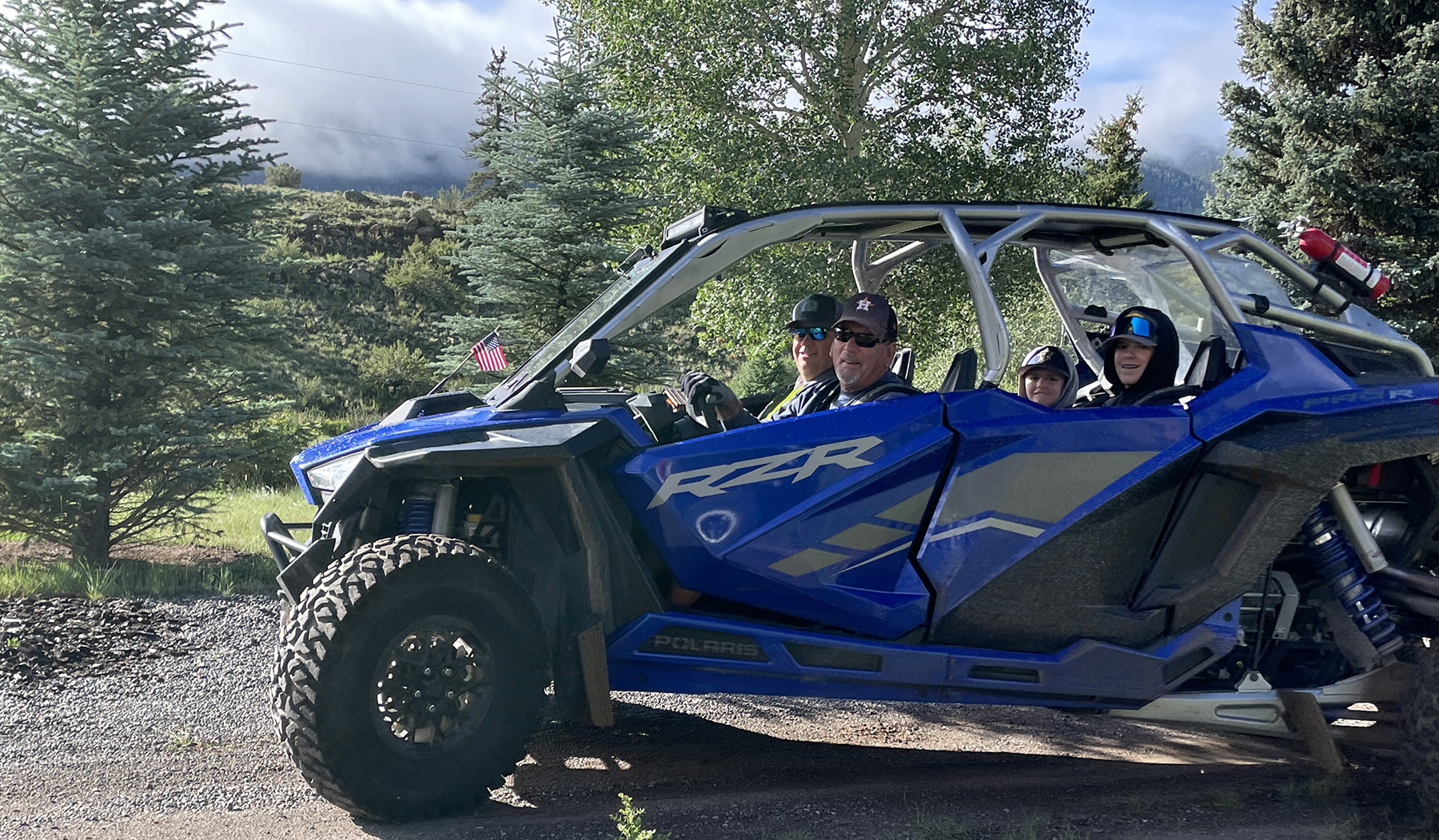 Another all-day ride we were able to take while the Bockovens were visiting worked out because friends offered to take them in their 4-seater SxS while Bill and Karen rode their own KRX 2-seater. It was so much fun riding along with such a big group. We started early morning, driving the SxSs to Antler’s Riverside Resort for breakfast out on the patio over the Rio Grande River. After breakfast it was riding on up to Love Lake, then past Love Lake to Copper Creek Falls. This was our first time doing this ride and it was amazingly beautiful. There were several SxS vehicles on the ride and at one point friends Gary and Lisa, one of the 4-seater couples, made Parker very, very happy with they offered to let him drive theirs. Karl and Blake continued to ride with our other friend Terry in his 4-seater. Karen had already let Parker drive our 2-seater down Bachelor’s Loop, so this was his second time to drive.